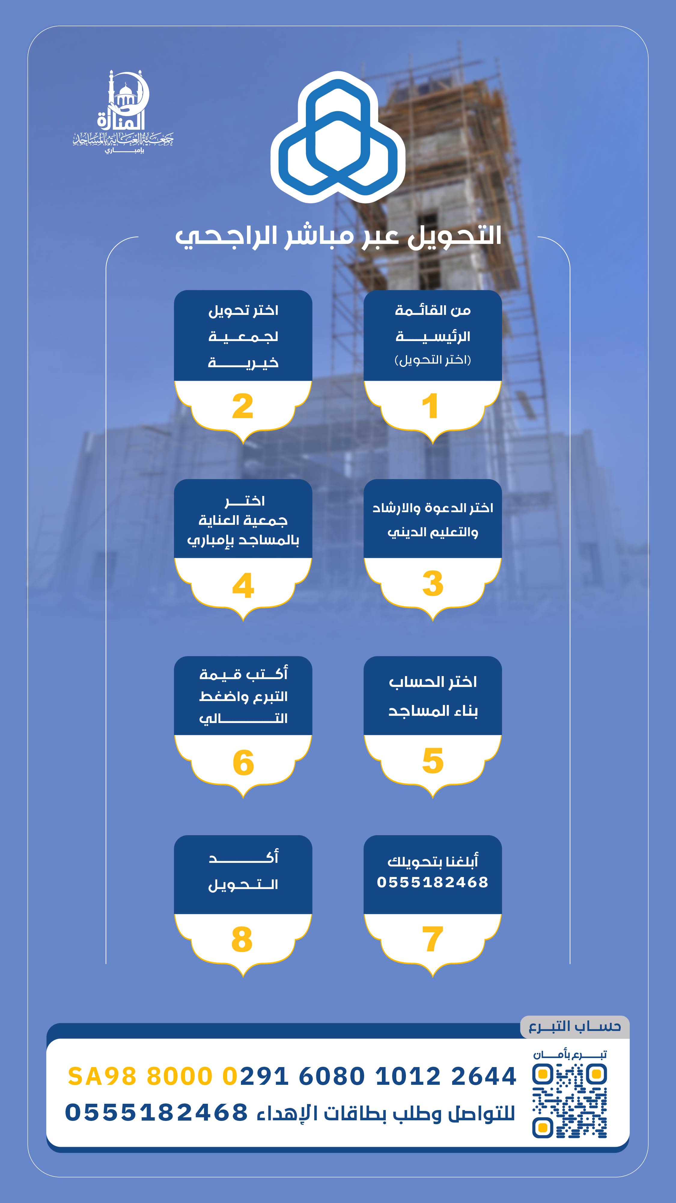 وتبرعك اليوم ليس لبناء الجدران، بل لبناء بيت يُعمّر بالذكر، ويُحيي النفوس، ويُنعش القلوب بالخيرات، وكل ريال تقدمه هو صدقة جارية، أجرها يتجدد مع كل صلاة تُقام، وكل دعاء يُرفع، وكل قلب يجد في المسجد طريقه إلى الله.